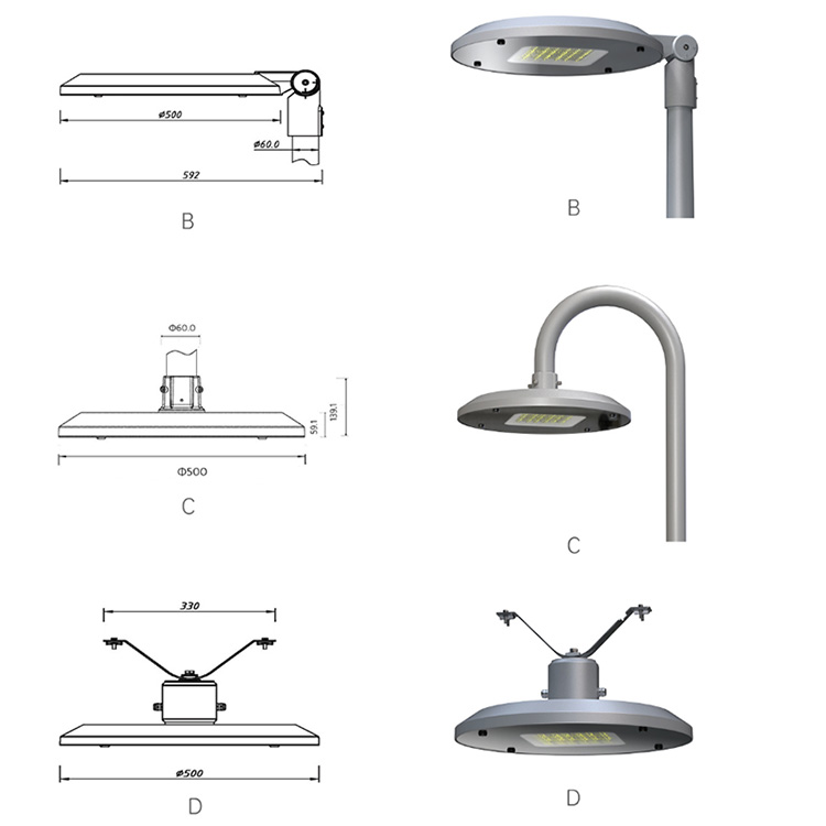 | Behuizingsgrootte (mm) | Φ500*500*450 | Φ500*500*168 | Φ500*500*139 | Φ500*500*286 | Aluminium behuizing, gepantserd glas, waterdichte rubberen ring, 304 roestvrijstalen schroeven, |