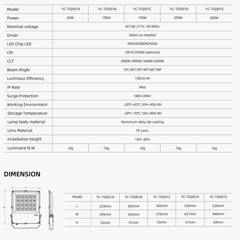 | YC-TGD01-50W | 358*294*52 | 50w | Heat sink Aluminum body,Glass,Bracket,304 screws, printplaat, LENS. |